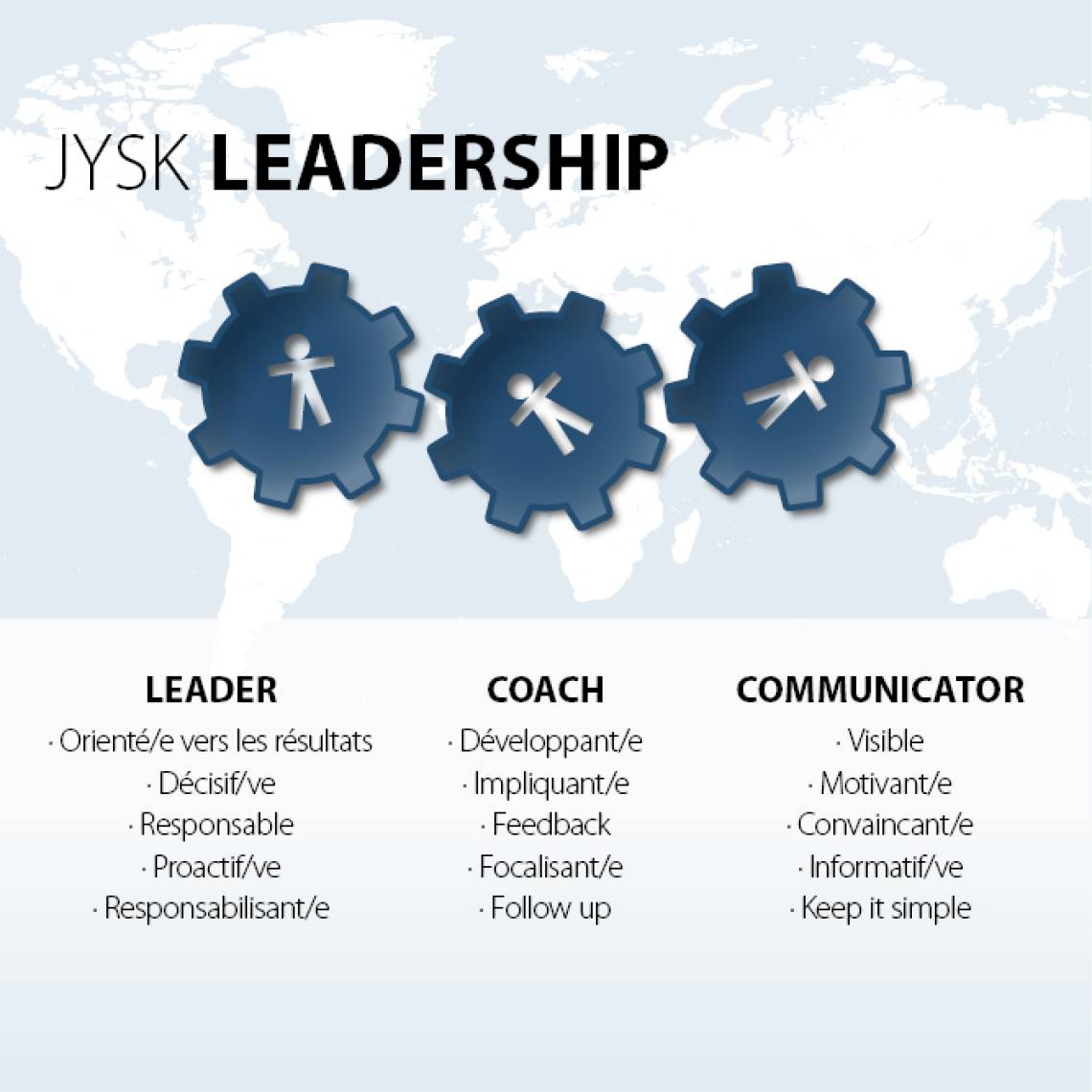En plus de nos valeurs fondamentales, nous attendons de nos managers qu'ils fassent preuve de leadership JYSK, qui se définit comme suit : Leader, Coach et Communicator.