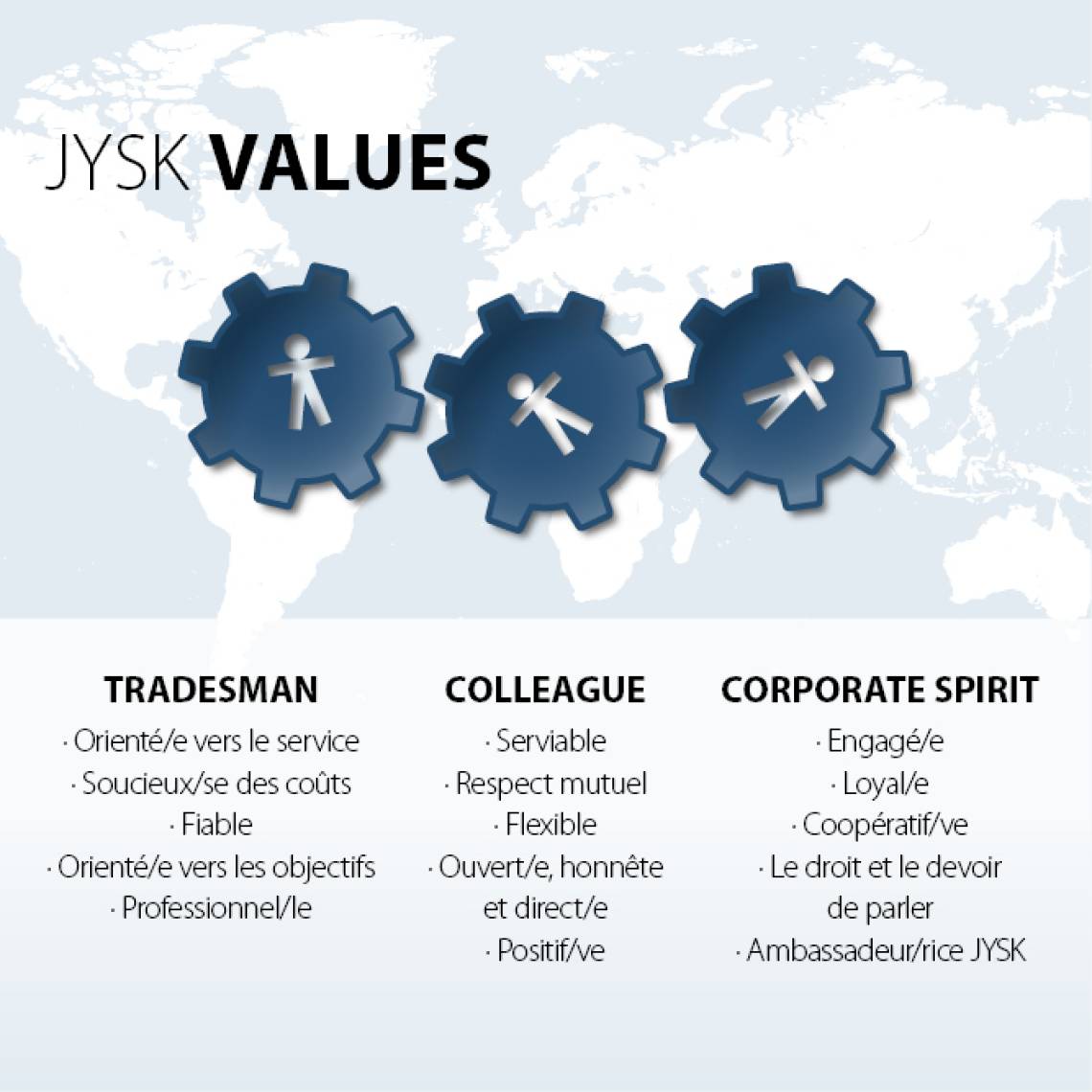 Les trois valeurs fondamentales de JYSK - Tradesman (commerçant), Colleague (collègue) et Corporate Spirit (esprit d'entreprise) - sont issues de notre fondateur, Lars Larsen. Elles expriment le comportement et l'attitude que nous pouvons attendre les uns des autres.