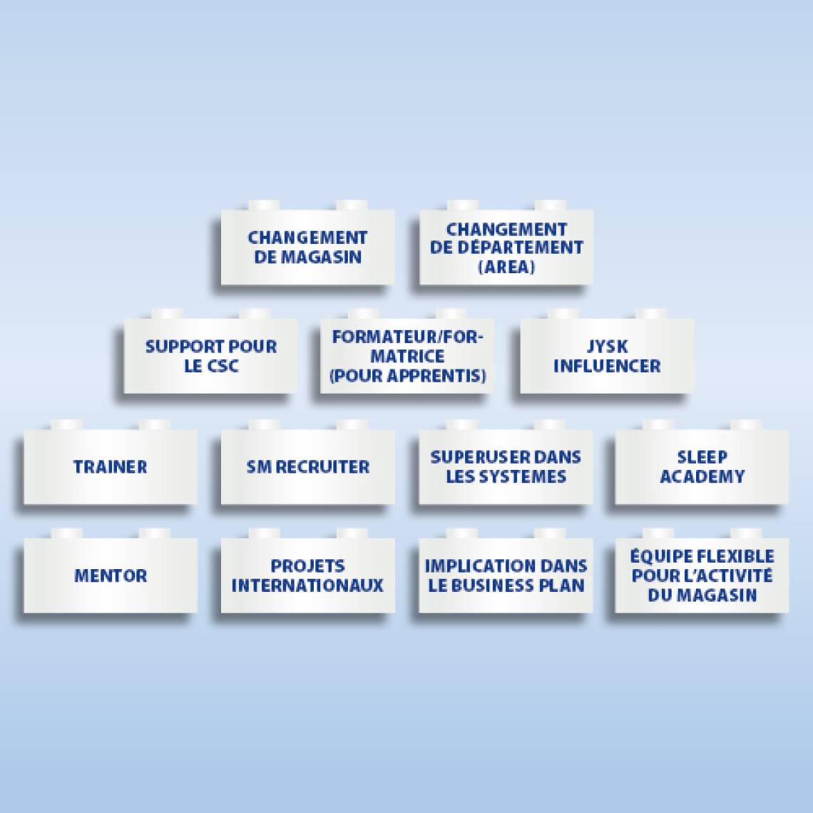Avec le programme "Choisis ta propre brique", nous aimerions te donner, en tant qu'employé JYSK, la possibilité de te développer dans ton poste.